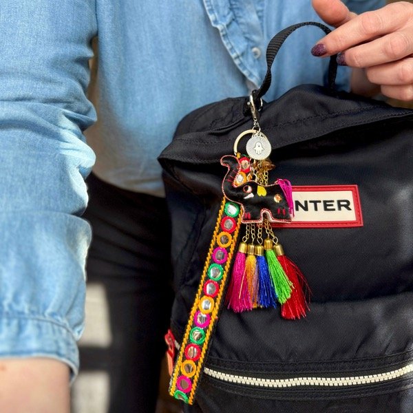 Charm con flequitos de colores, galón simil espejitos, y elefantito bordado, todo traído de India!