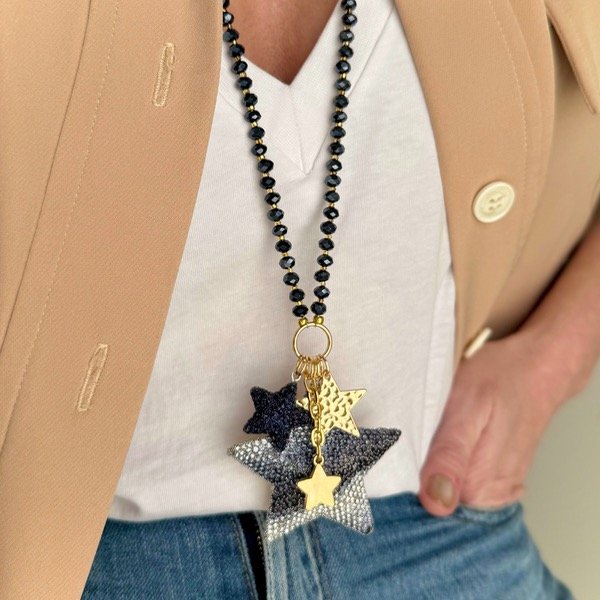 Collar de cristales facetados peltre, intercalados por mini mostacillas calibradas doradas. En el centro tiene mix de dijes dorados más estrella de strass. El collar mide 85 cm